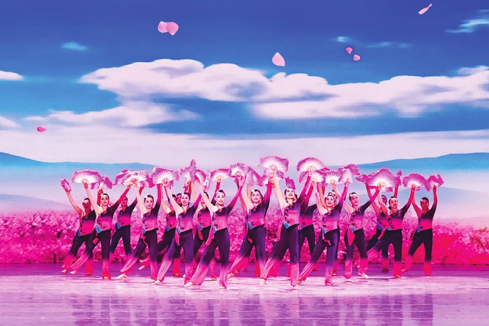 《又见桃花红》以山西经典民歌为创作根基,融入左权“开花调”灵动跳跃的音乐节律,既保留传统民歌“曲调高亢、情感真挚”的精髓,又创新采用“传统+现代”的融合表达。创作团队将山西民舞的经典动作与现代广场舞的活力元素有机结合。舞者们以舒展灵动的肢体语言勾勒出“桃花绽放、春满三晋”的唯美画卷,服饰上的桃花纹样与青白色调相映成趣,既象征三晋大地的青山绿水,又传递质朴纯真的乡土情怀。