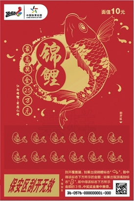 10元面值玩法规则为:刮开覆盖膜,如果出现锦鲤标志即中得该标志下方所示的金额;如果出现顶呱刮标志即中得该标志下方所示金额的3倍,中奖奖金兼中兼得。