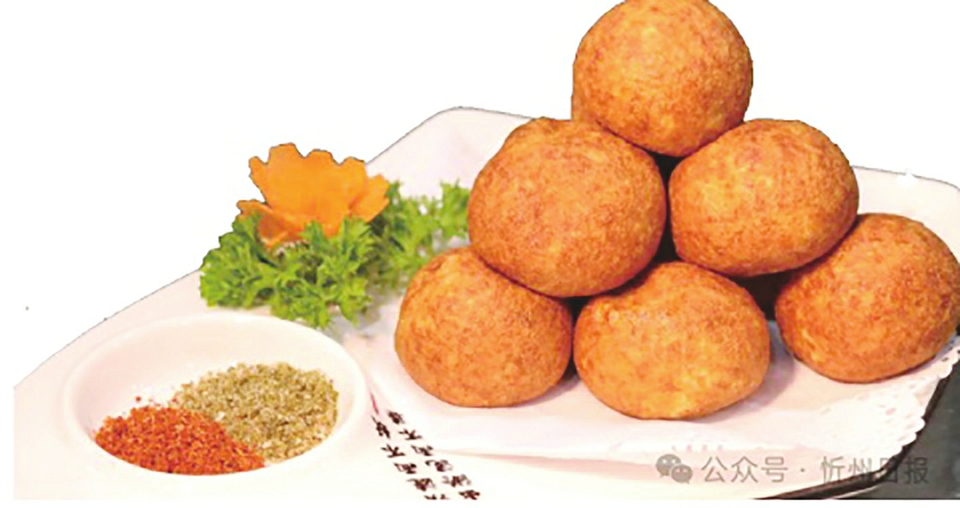 豆腐丸子是五台传统宴席上的必备美食,既可作为主角蘸料吃,也可化身为烩菜、煲汤中的点睛之笔。油炸豆腐丸子是当地家喻户晓的美味。这道菜精选五台山卤水豆腐,挤出多余水分,压成细腻豆腐碎,加入佐料搅拌。团丸子十分考验手艺,大厨3秒就能将松散的豆腐碎揉成圆润紧实的丸子。蒸制后静置在麦芽糖水中定型再开炸。五成油温,丸子滚入,外衣渐镀“金甲”,内里却保持着豆腐的柔嫩本味。