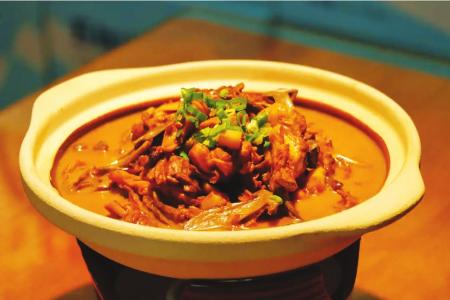 在五台山景区杨柏峪村,有一道招牌菜——台蘑炖小鸡,主要食材为台蘑和清远鸡。台蘑来自北台顶,肉质肥厚、口感细腻;清远鸡鲜嫩不柴。制作过程处处讲究,先泡发台蘑、处理鸡块,用十几种调料煸炒鸡块,再与泡发好的台蘑小火慢炖40分钟,让山珍的鲜味与鸡肉的醇香充分融合,最后大火收汁。这道菜将台蘑的鲜香与鸡肉的醇香完美平衡,汤汁浓郁不腻。