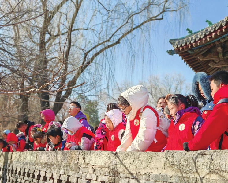 “原来《西游记》里孙悟空变的小庙原型就是水镜台!”“老师说‘鱼沼飞梁’是我国现存唯一的十字形桥,是立交桥的雏形。”“我觉得圣母殿里的彩塑侍女像很美。”“难老泉水从地下岩层流出,水温常年保持17度,因此不会结冰。”冬日的晋祠,古建静立,泉水潺潺,学生们行走在圣母殿、水镜台、鱼沼飞梁之间,你一言我一语地分享着自己的新发现、新感受。