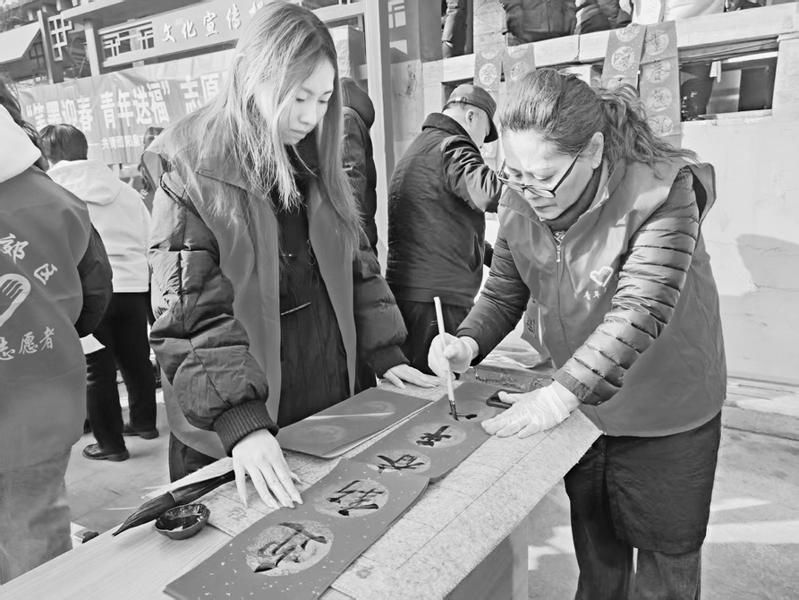 1月28日,团阳泉市郊区区委联合郊区青年志愿者协会,在荫营镇上荫营社区广场开展了“笔墨迎春 青年送福”写春联、送春联志愿服务活动。来自该区的27名青年志愿者和8名书法老师积极参与,把浓浓年味和新春祝福送到群众手中。