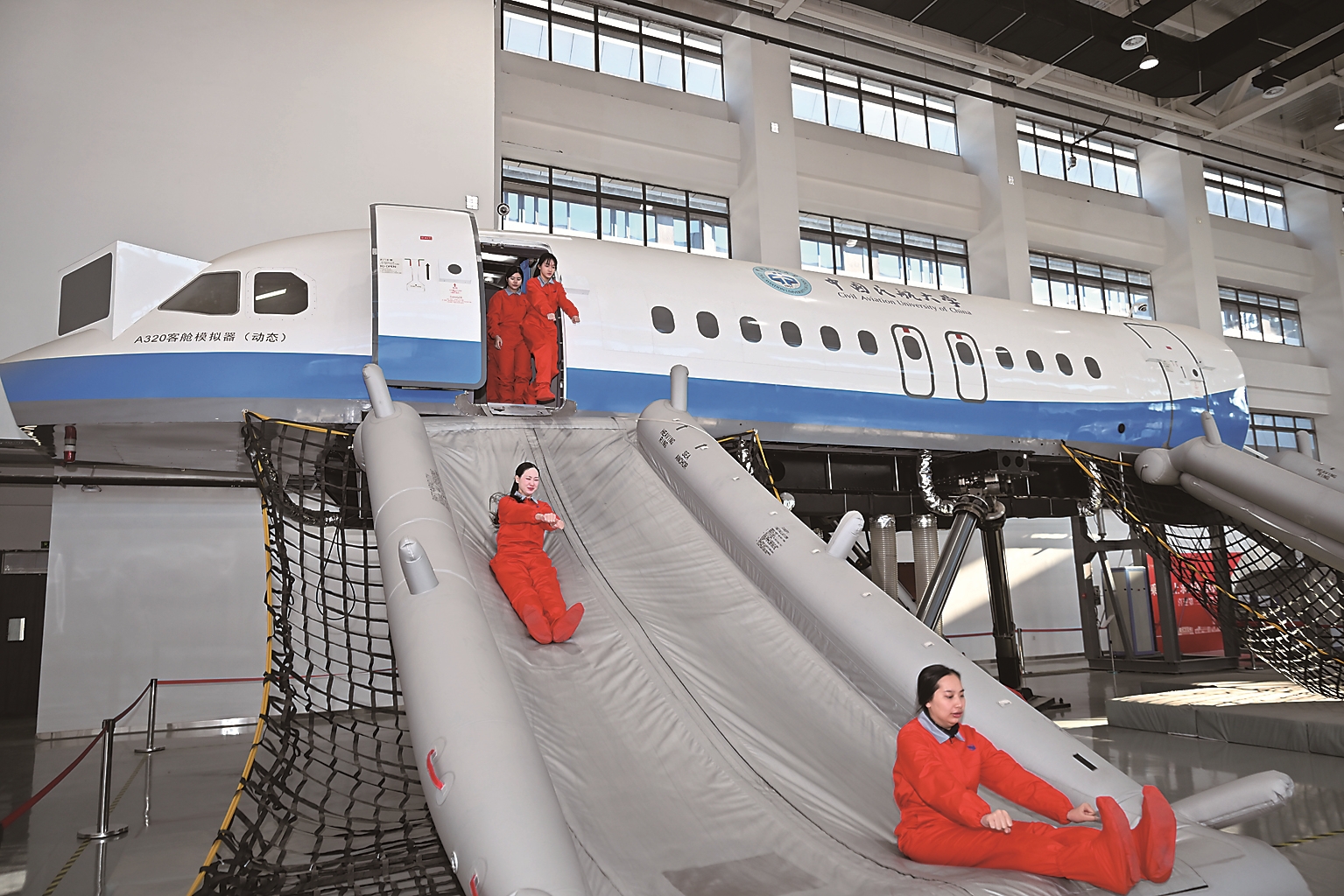 在中国民航大学,泰国学员在客舱模拟器中进行实操培训(1月20日摄)。 2月3日,中国民航大学与泰国川登喜大学合作的首期短期研修项目结业仪式在天津举行。28名泰国学员在中国民航大学完成了客舱安全管理、服务心理学等为期三个月的专业学习,并在高度仿真的客舱模拟器中开展实操训练,掌握应对各类机上突发状况的技能。 新华社记者 孙凡越 摄