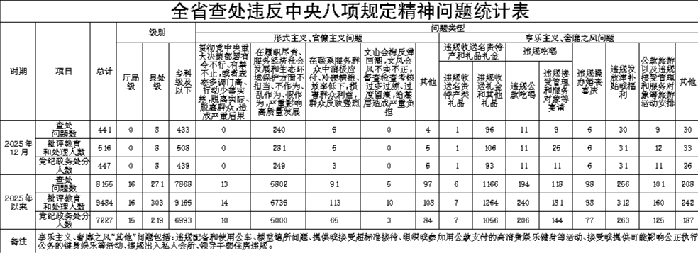2025年12月全省查处违反中央八项规定精神问题441起