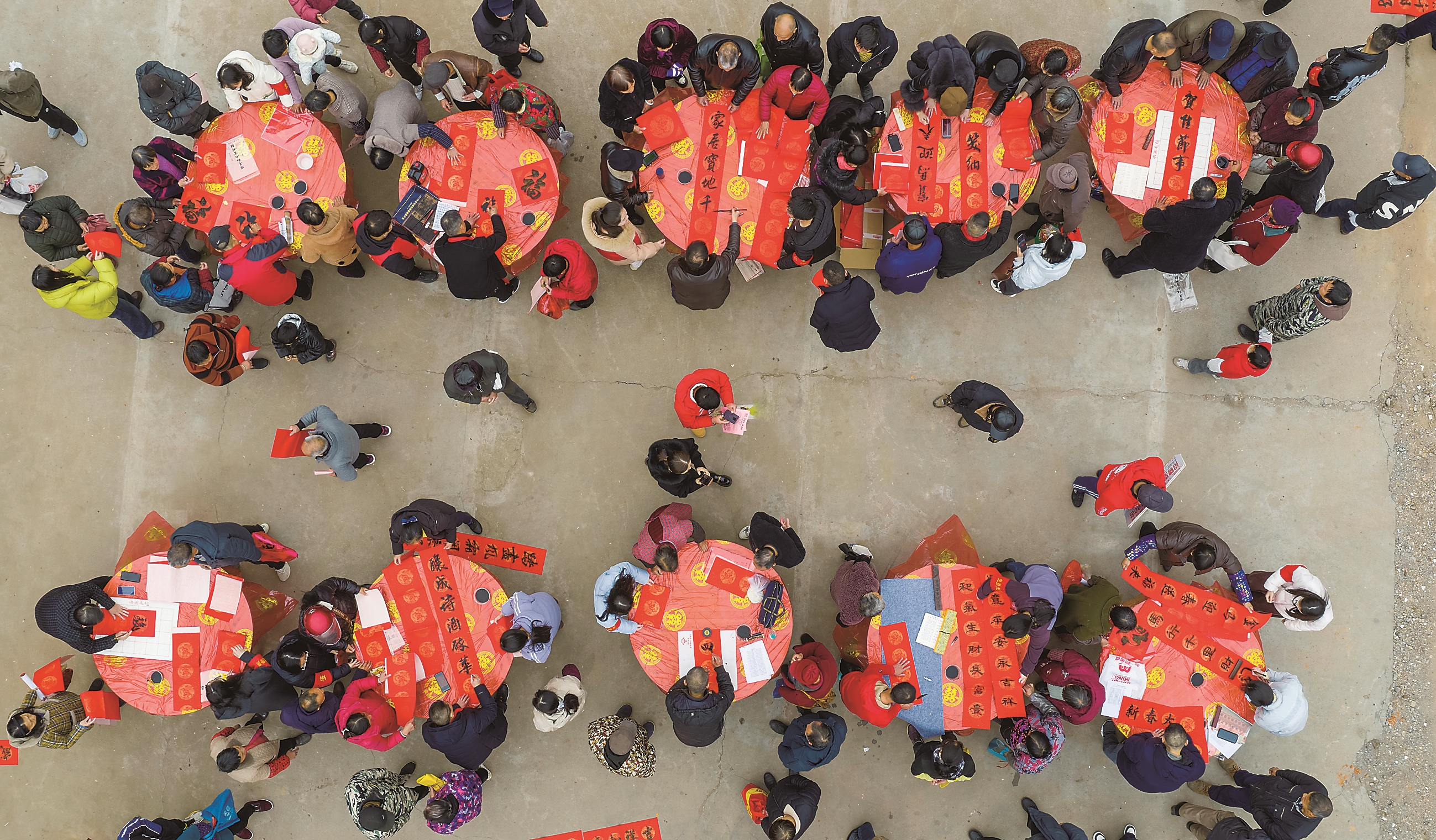 2月4日,在江西省宜春市樟树市经楼镇老农贸市场,专业书法老师为群众书写春联(无人机照片)。新春将至,年味渐浓。各地举办年货大集、写福字春联等活动,人们选购鲜花、中国结等饰物,迎接新春。 新华社发(周亮 摄)