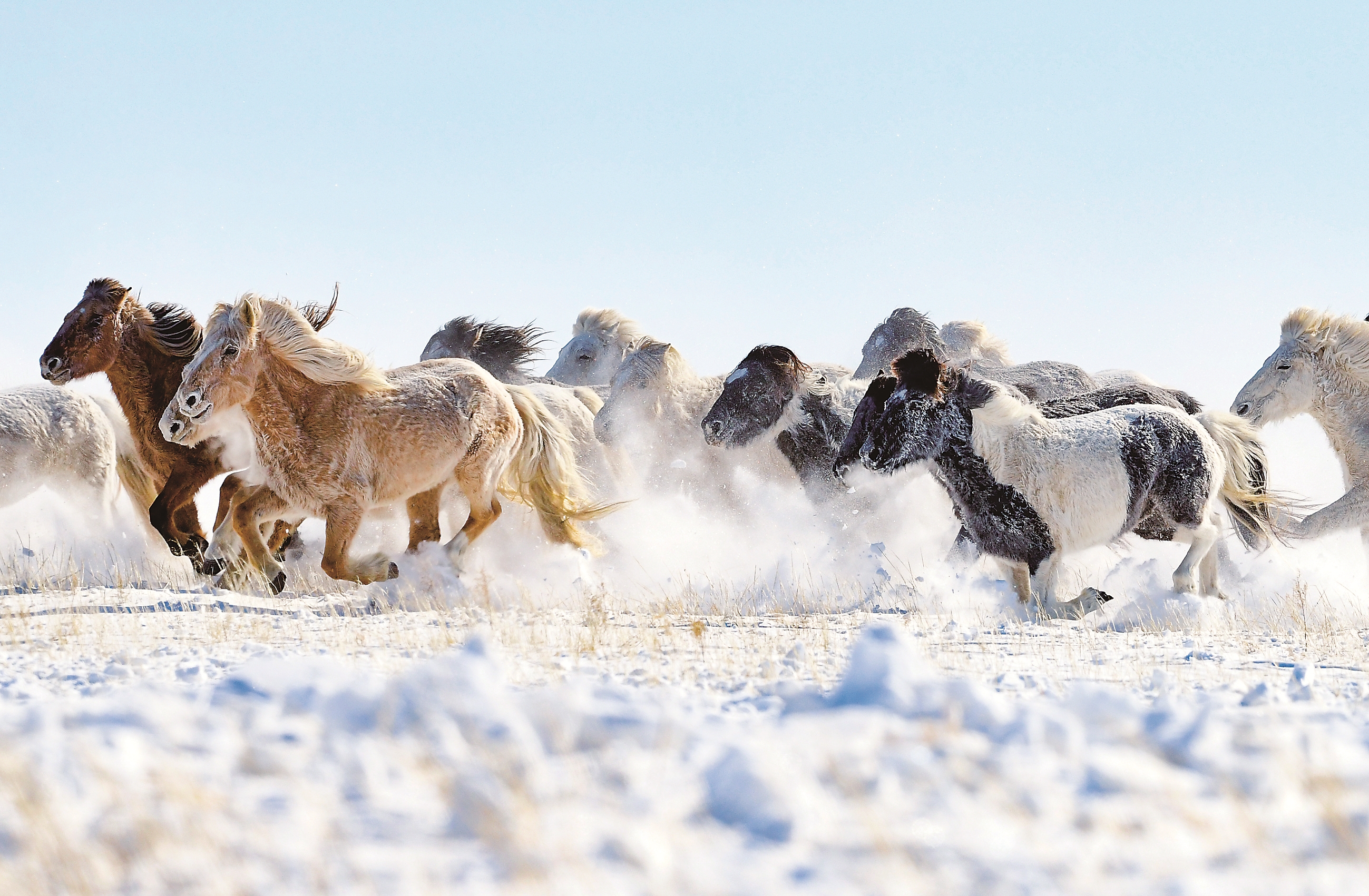2月5日,马群在凤凰马场的雪原上奔驰。2月5日,位于内蒙古自治区锡林郭勒盟锡林浩特市的凤凰马场举办“策马踏雪迎新春”主题活动,当地牧民在雪原上驯马,呈现雪原奔马壮观景象,喜迎马年春节。 新华社发(王正 摄)