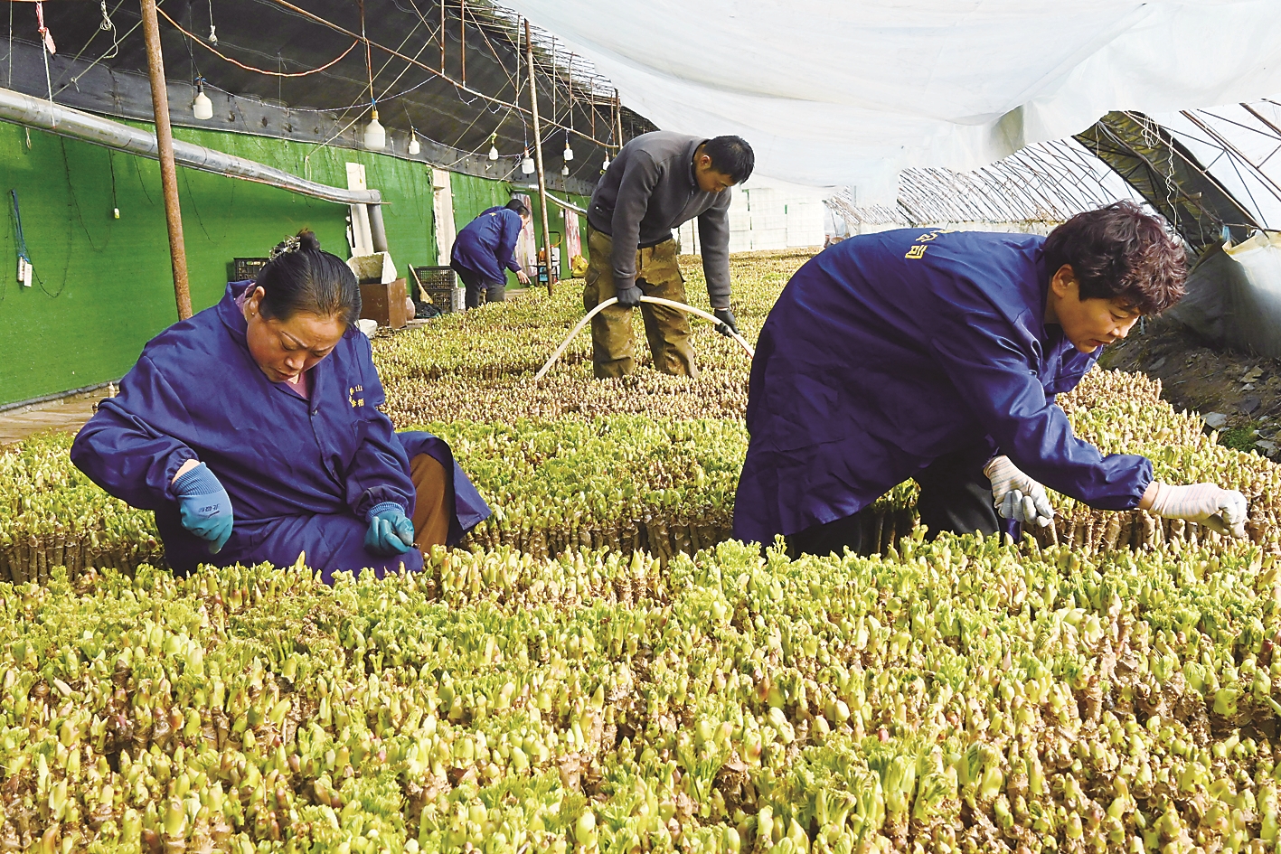 近年来,白山市江源区依托“公司+基地+农户”模式,大力发展反季山野菜种植产业,带动农户就业增收。图为村民们在温室大棚内打理刺嫩芽。 本报记者 钱文波 摄