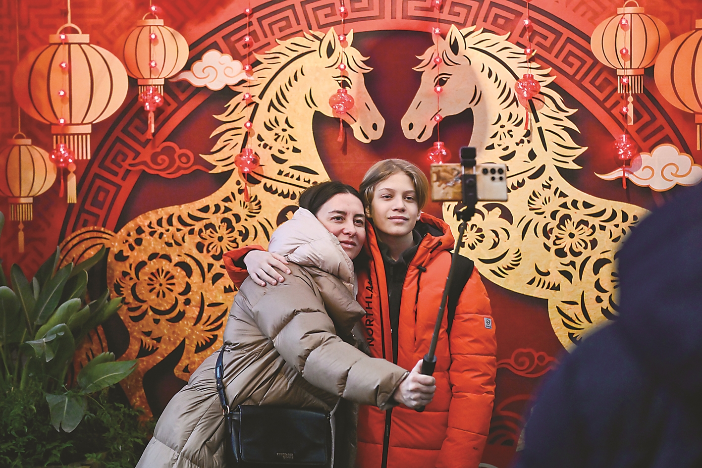 2月7日,在俄罗斯首都莫斯科,参观者在莫斯科国立大学植物园“药剂师花园”拍照。春节将至,莫斯科国立大学植物园“药剂师花园”举办春节庆祝活动,吸引市民前来参观。 新华社发(亚历山大 摄)