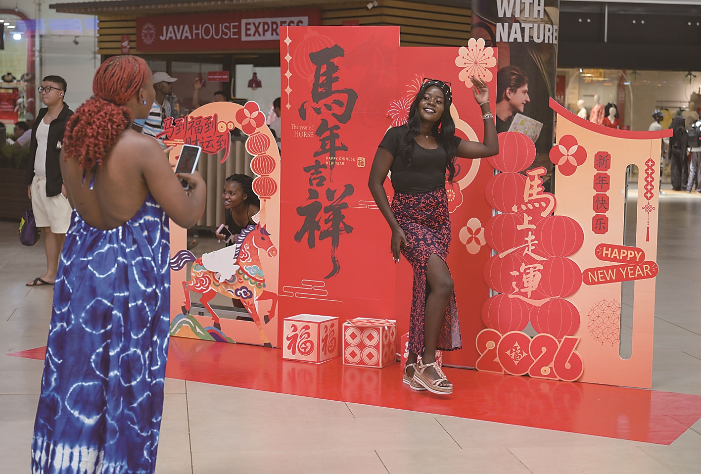 2月8日,2026内罗毕中国春节庙会在肯尼亚首都内罗毕开幕。图为人们在“马年吉祥”打卡点拍照留念。 新华社记者 杨光 摄