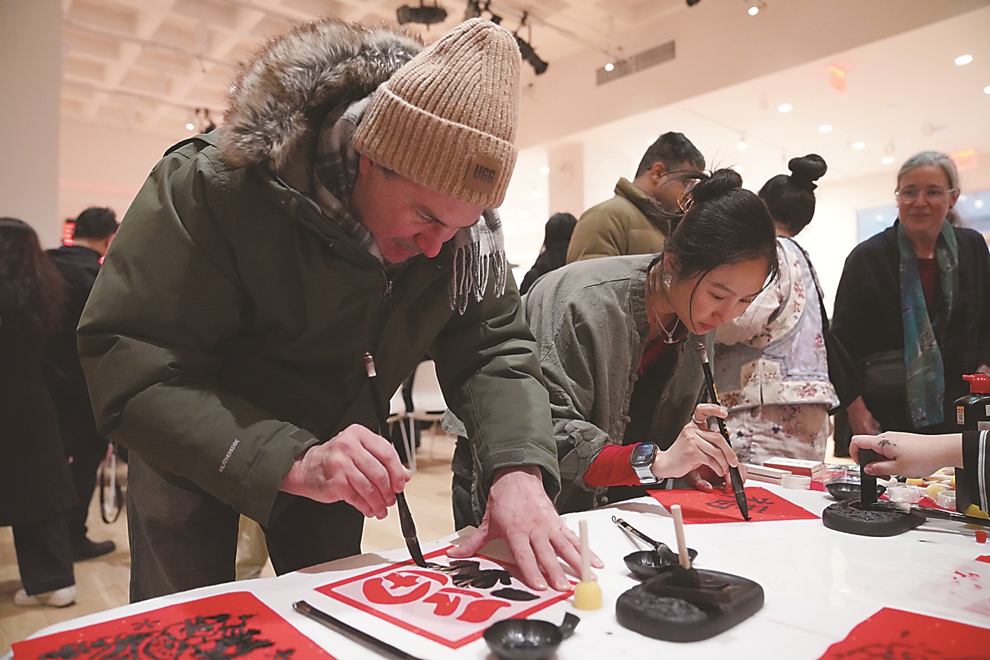 2月8日,“中国味道”春节文化活动在美国纽约启幕,400余名中外嘉宾齐聚一堂,品尝中国美食,欣赏非遗技艺,迎接农历新年。图为活动现场人们在体验中国书法。 新华社记者 张凤国 摄