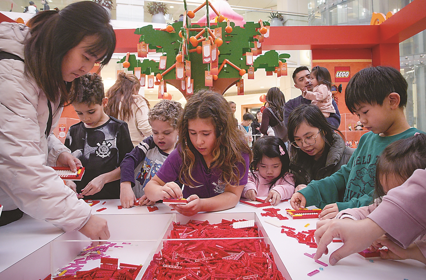 2月8日,加拿大伯纳比市的一家购物中心举行乐高春节主题活动,观众在这里动手搭建积木,共同迎接即将到来的马年春节。 新华社发(梁森 摄)
