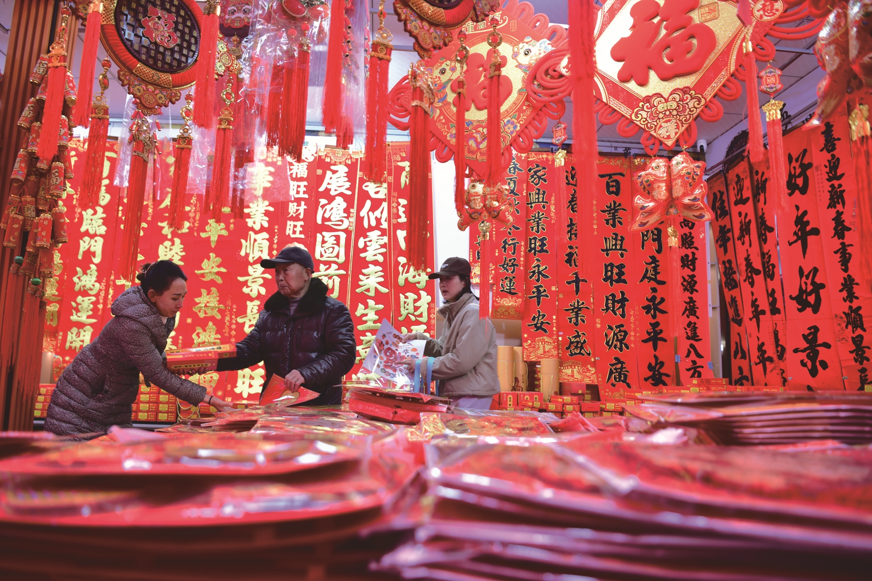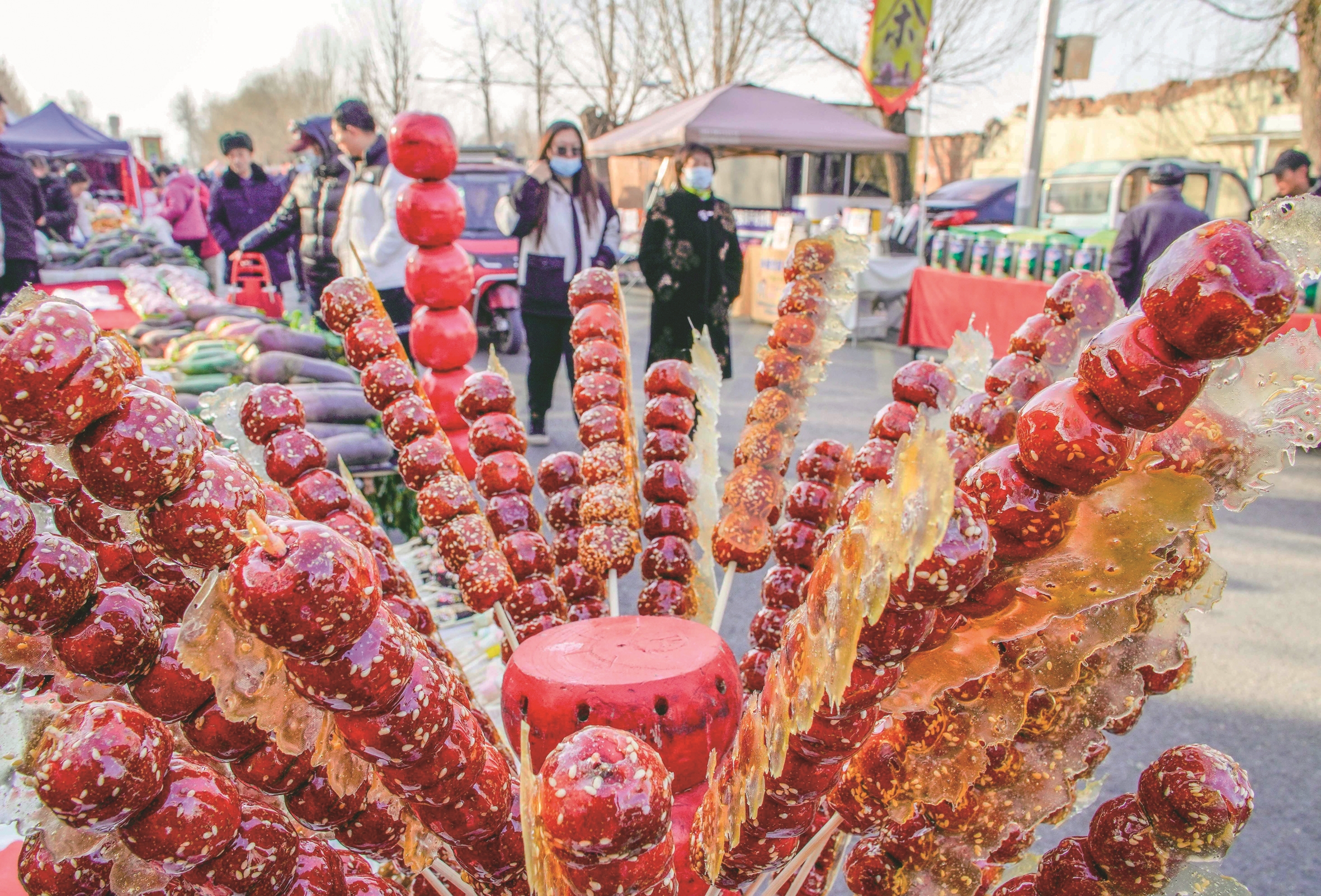 2月12日,人们在北京市平谷区南独乐河镇大集购买年货。 新华社发(张春雷 宁文武 刘满仓 摄)