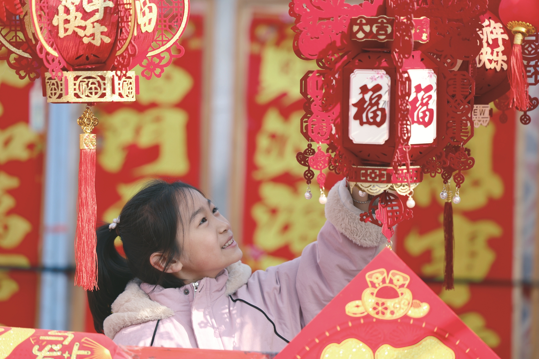 2月13日,在山东省临沂市郯城县郯城街道年货市场,小朋友在选购春节饰品。