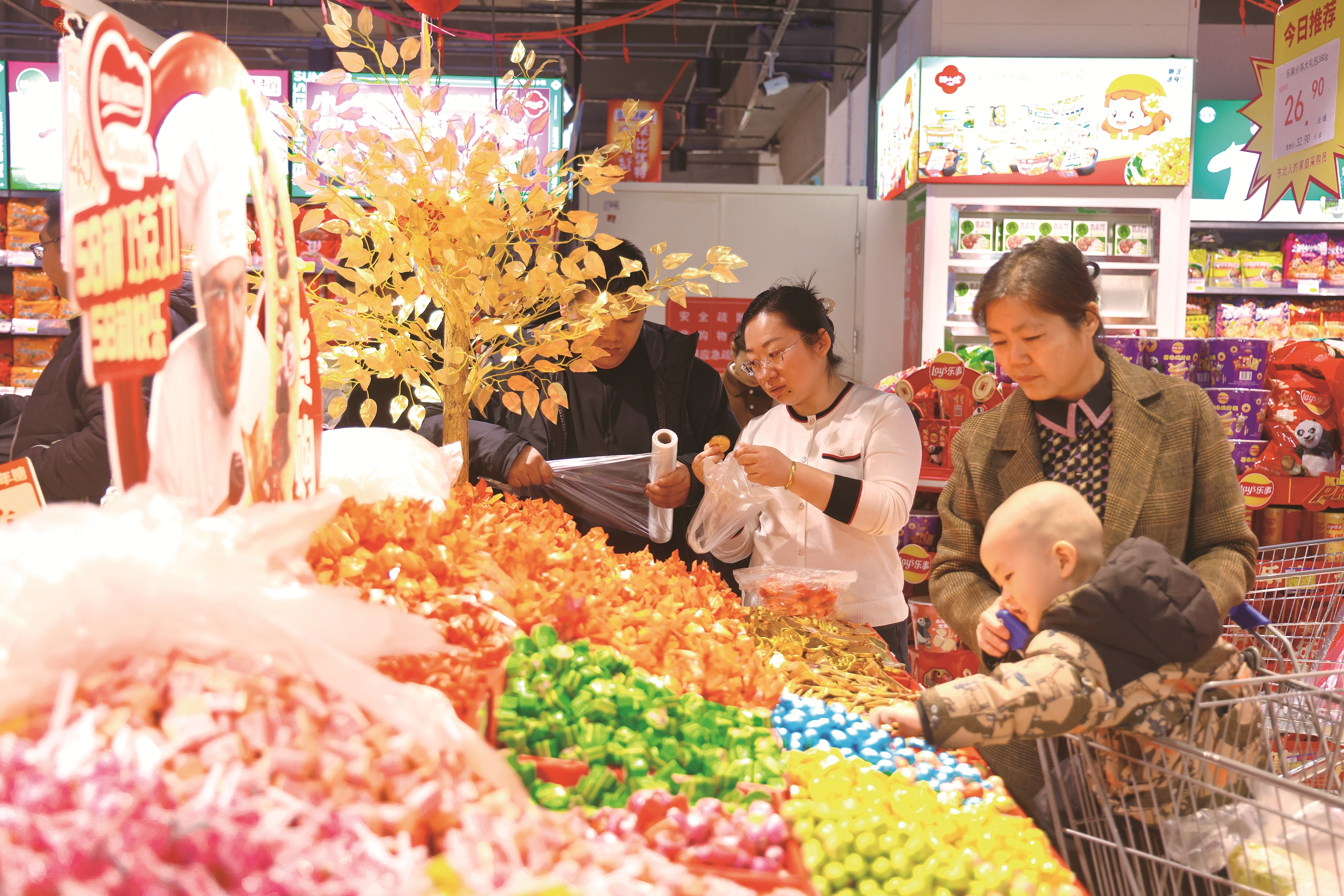 新春佳节,我省各大商超、农贸市场及供销集市内呈现出一派红红火火的繁荣景象,从粮油肉蛋到鲜果时蔬,各类民生商品品类齐全、储备充足,节日市场供应量足价稳。 本报记者 潘硕 摄