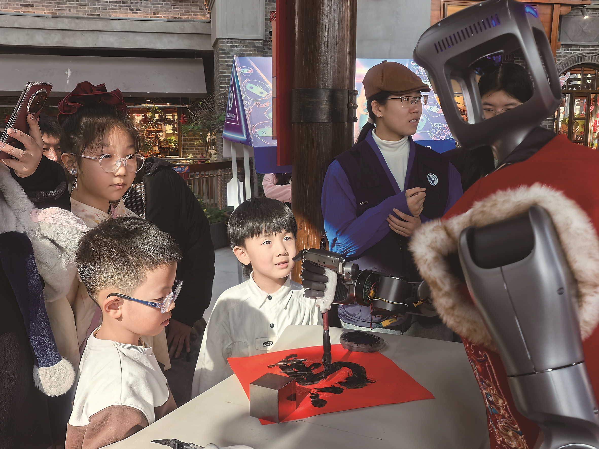 春节期间,吉林省仿生机器人创新中心携手“这有山”,打造开年科技游园会,以仿生机器人解锁科技新玩法。图为一台仿生机器人正在书写“马”字,吸引了众多游客驻足观看。 本报记者 徐慕旗 实习生 卢姝羽 摄