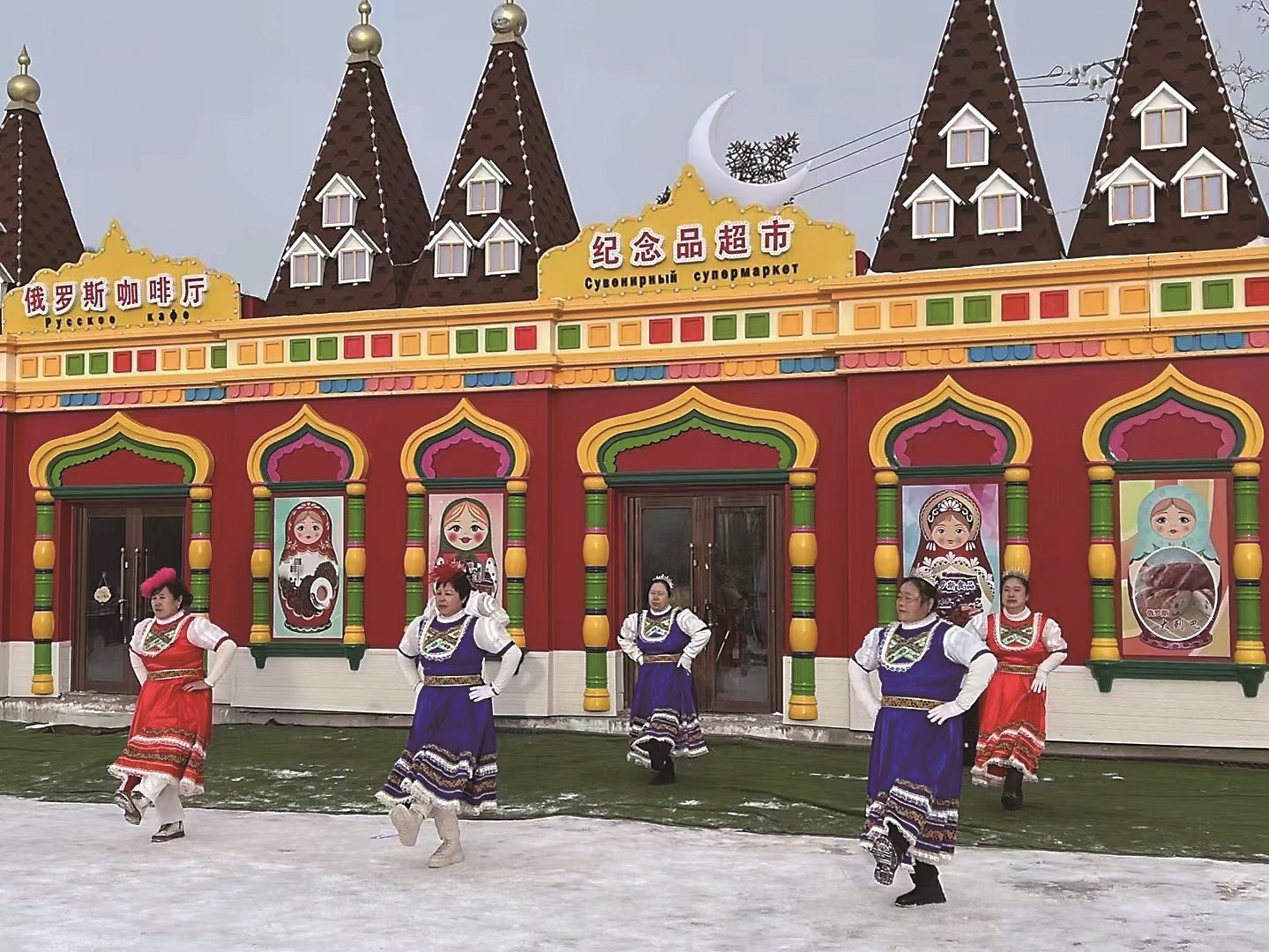 “快进来暖和暖和,刚烤好的大列巴!”村党支部书记李健站在普希金民宿门口,冲着一群刚下车的游客招手。院子里,孩子们在雪地里打滚,年轻姑娘们围着彩绘套娃自拍,老人们则站在金顶钟楼下,听返乡游子讲当年闯荡俄罗斯的故事。