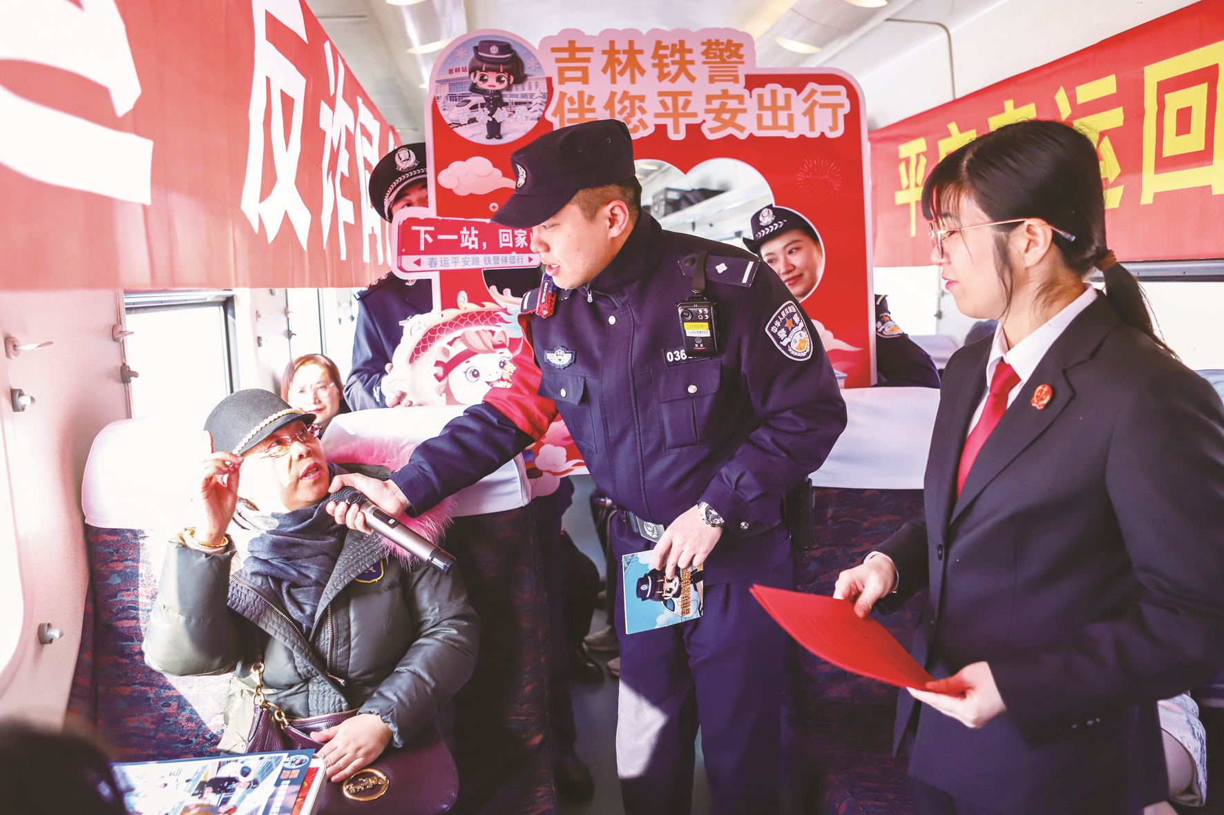 近日,吉林铁路运输法院第三党支部组织法官干警,联合沈阳铁路公安局吉林公安处乘警支队,在吉林开往西安的K1572次列车上,开展“党建引领护春运·平安反诈贺新春”主题普法活动,为广大旅客欢度新春保驾护航。 崔岩 崔佳 摄
