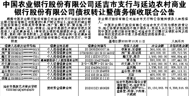 中国农业银行股份有限公司延吉市支行与延边农村商业银行股份有限公司债权转让暨债务催收联合公告