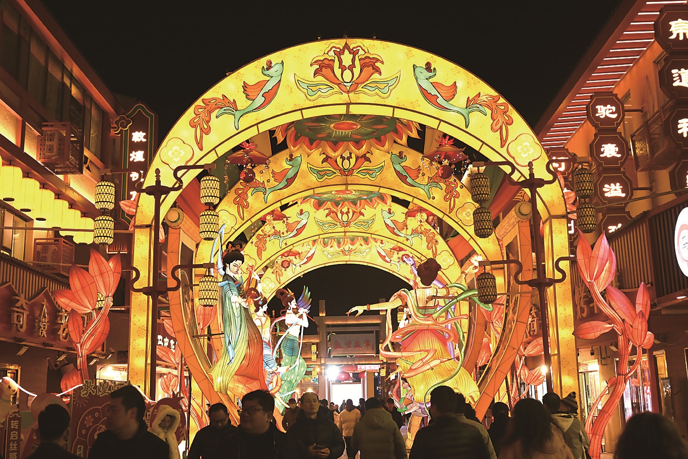 元宵节将至,各地举办丰富多彩的活动,喜迎佳节。 3月1日,人们在甘肃省敦煌夜市举办的敦煌灯会上观赏花灯。 新华社发(张晓亮 摄)