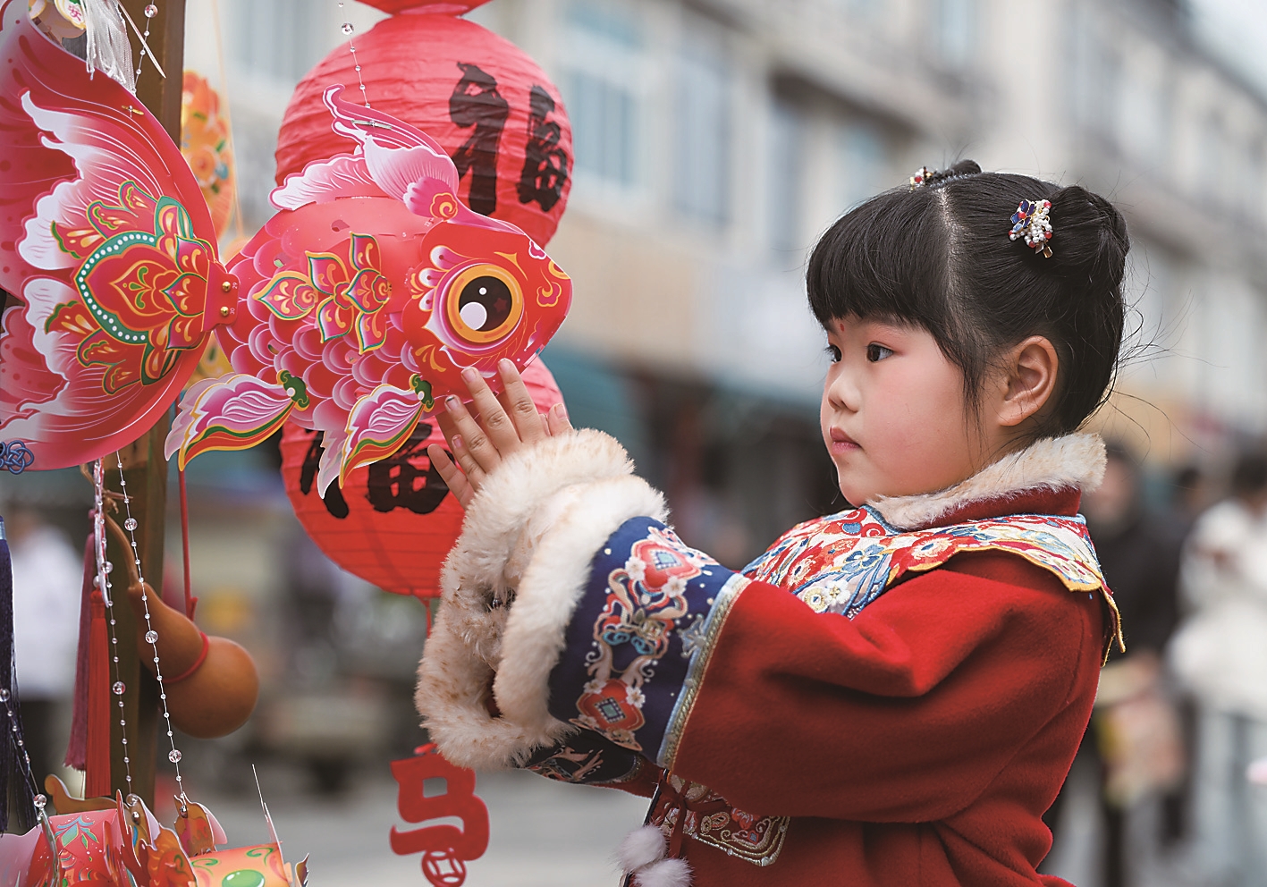 2月28日,一名小朋友在浙江省宁波市宁海县强蛟镇举行的元宵鱼灯巡游活动中观赏鱼灯。 新华社发(胡学军 摄)