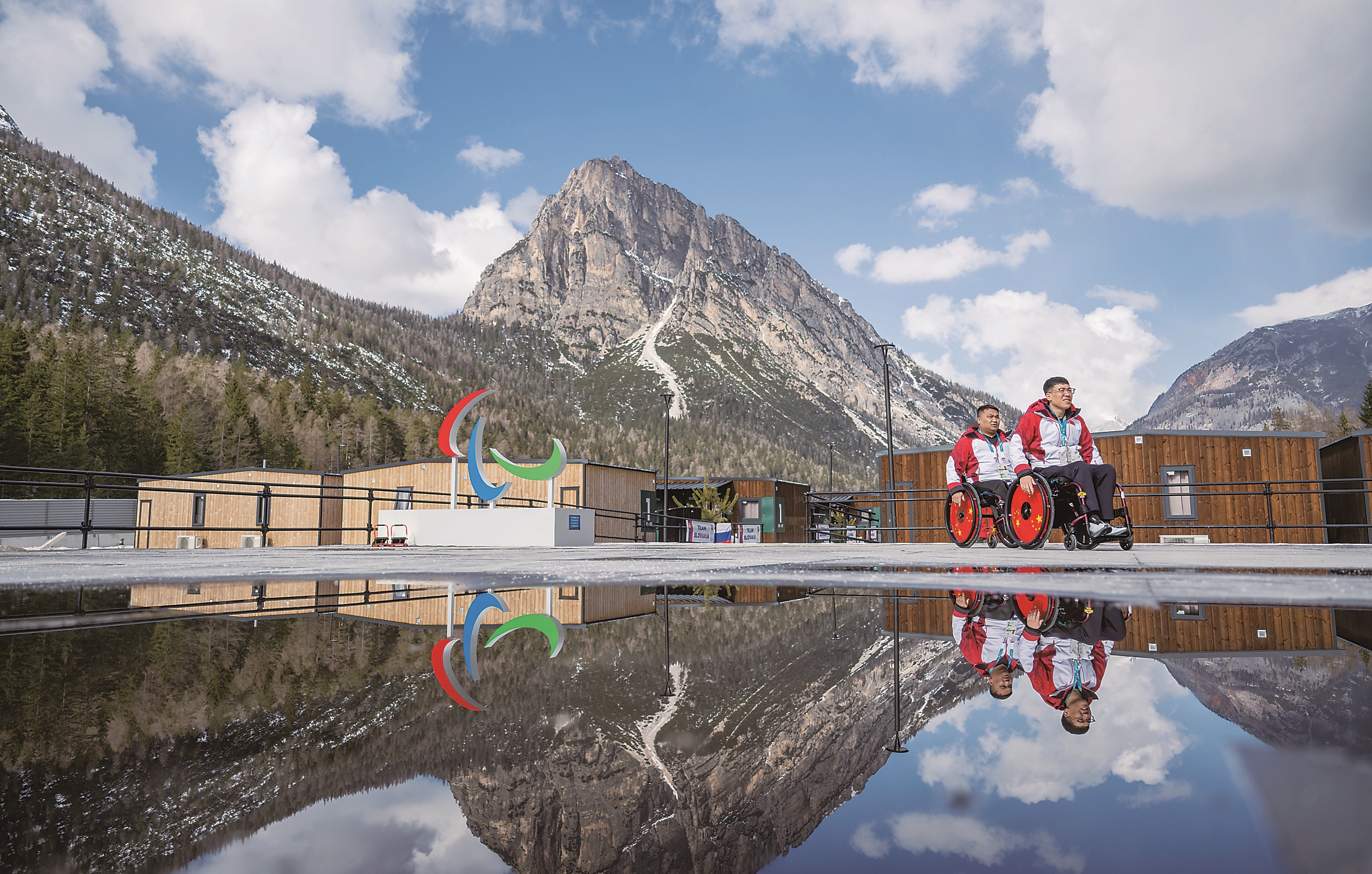 3月3日,中国残奥冰壶队运动员陈建新(右)、王海涛在残奥村内。 当地时间3月3日,米兰-科尔蒂纳冬残奥会科尔蒂纳残奥村向媒体开放。 新华社记者 连振 摄