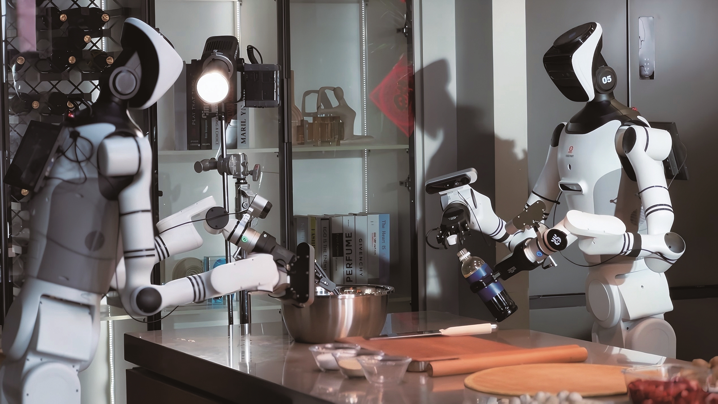 这场看似简单的“厨房秀”,实则完成了一系列高难度动作:14公斤力控的冰箱门精准开启、零洒落的液体平稳搬运、仿人力控的细腻“和馅”操作。每一个动作背后,都是对机器人综合能力的极限测试。支撑这一切的是睿尔曼“硬件+数据+远程作业网络”的技术支撑——睿尔曼把真实人手的操作,在人形机器人数据训练中心拆解成原子动作,通过大量真机数据积累与反馈,构建起可泛化的动作模型。