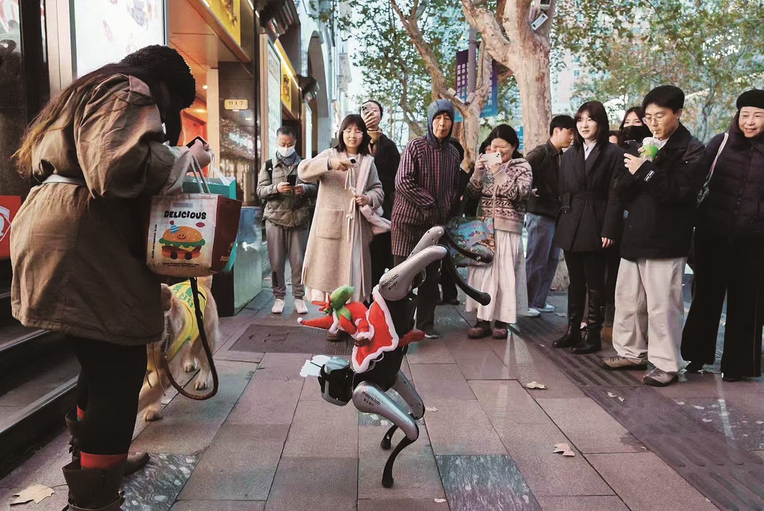 魔法原子四足机器狗MagicDog在店前迎宾,展示倒立技能,吸引市民游客观看。 受访者供图