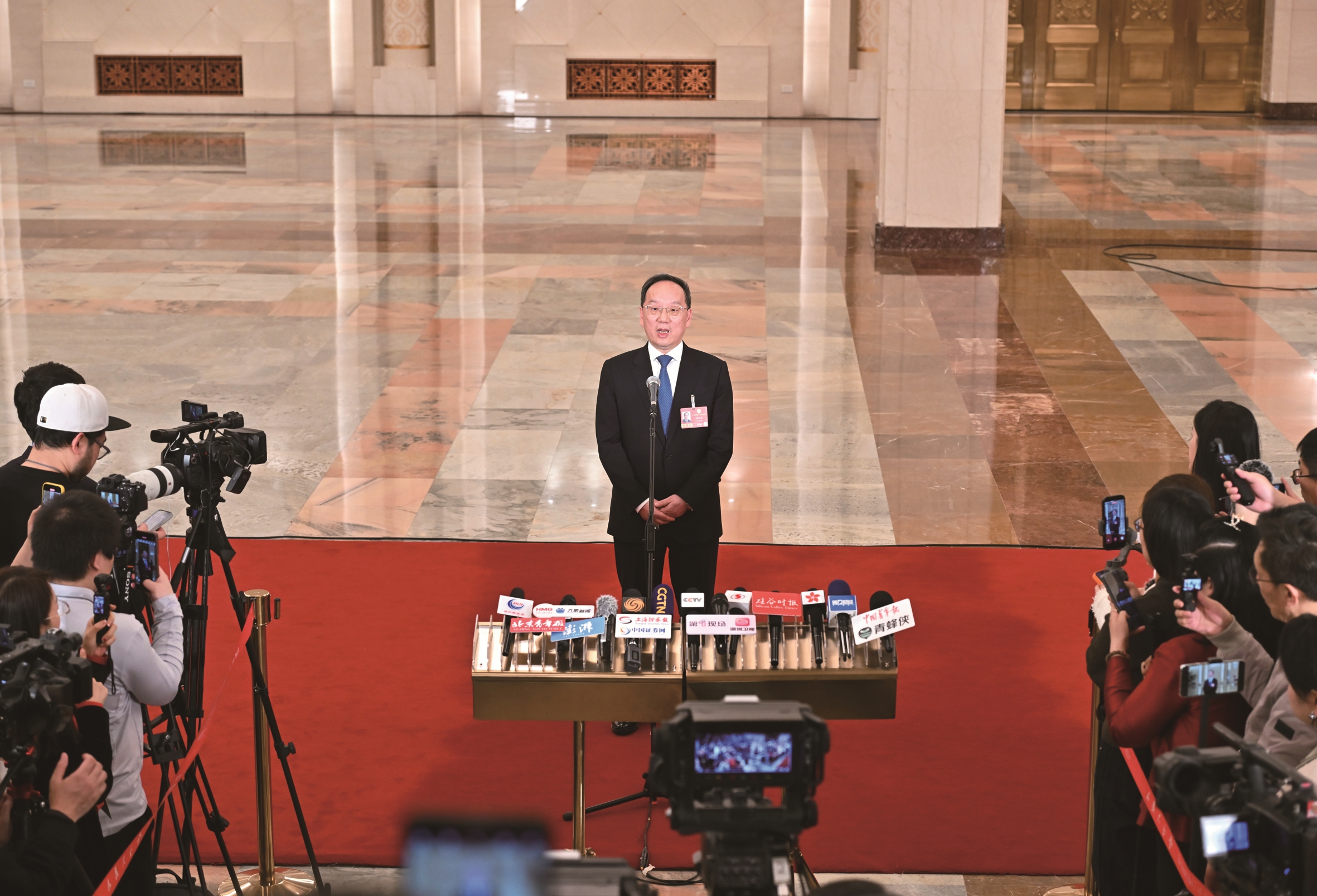 3月5日,第十四届全国人民代表大会第四次会议首场“部长通道”集中采访活动在北京人民大会堂举行。这是工业和信息化部部长李乐成接受媒体采访。 新华社记者 李鑫 摄