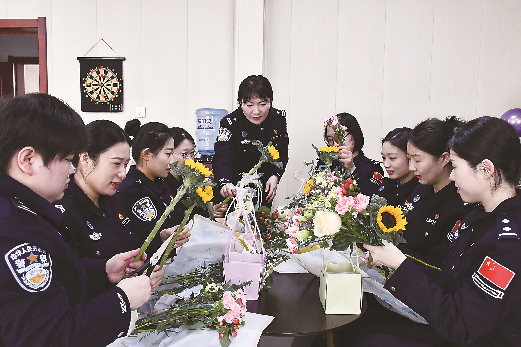 为庆祝“三八”国际妇女节,吉林临江边境管理大队组织开展主题插花活动。女警们用一束束鲜花表达对生活的热爱,彰显了女警队伍的活力与风采。 王昊阳 本报记者 钱文波 摄
