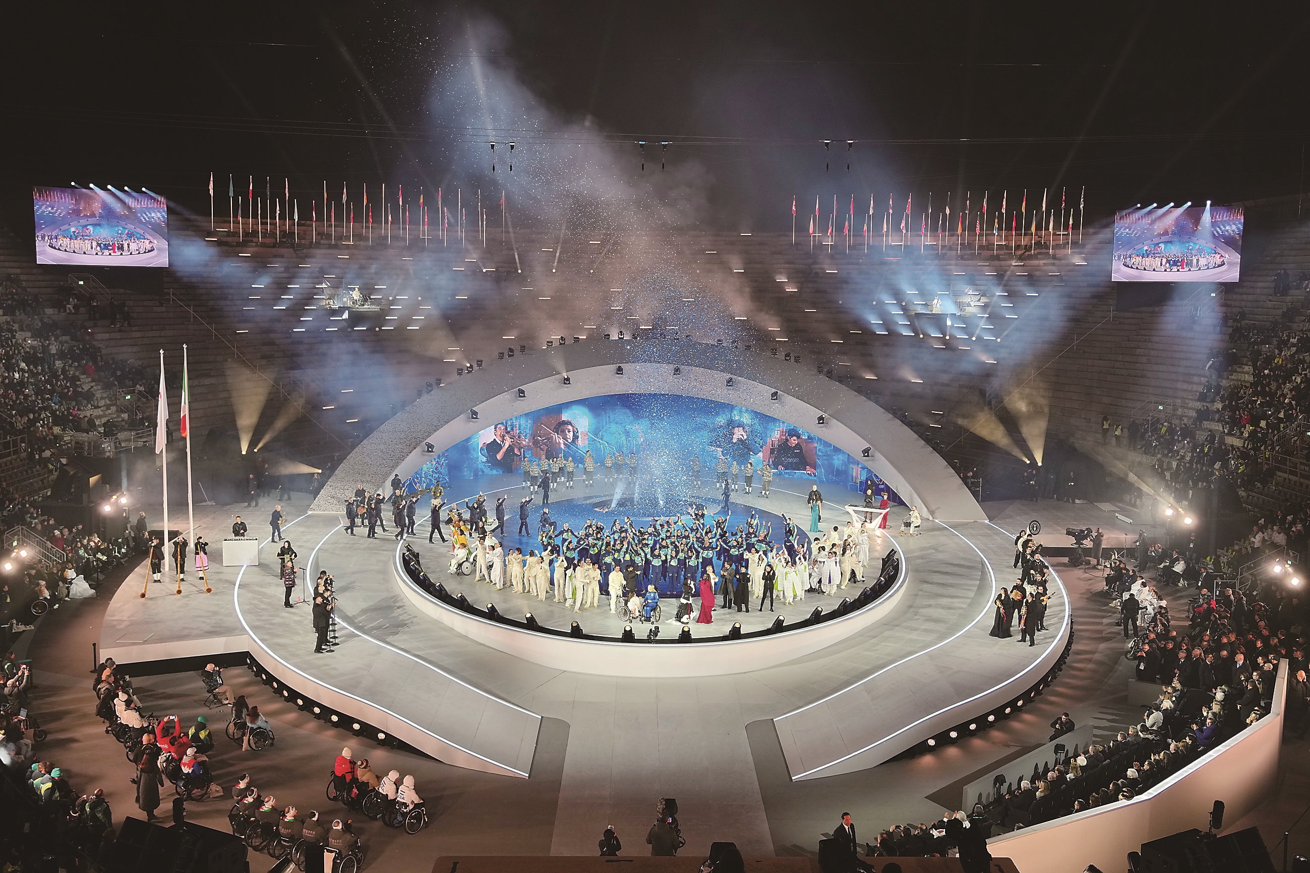 明亮的光柱交汇升起,有着两千年历史的维罗纳竞技场在夜空下瞬间焕发生机,这是残奥会开闭幕式首次在联合国教科文组织世界遗产地举办。竞技场中间的舞台呼应着这座大型古罗马圆形剧场的曲线造型,舞台中央的地面显现当晚开幕式的主题——“生命的律动”。