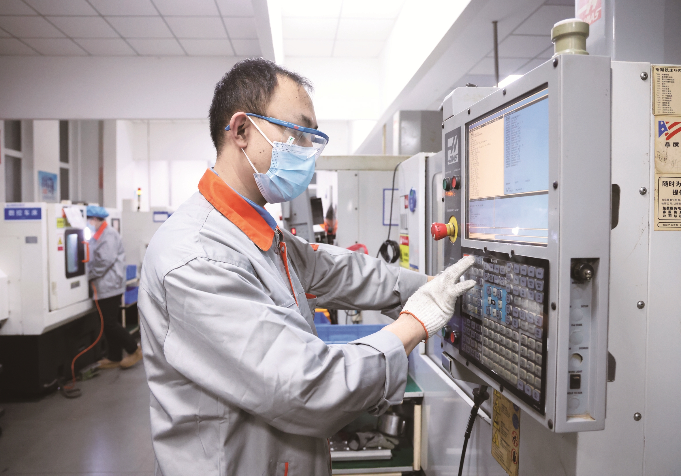 连日来,长春新区企业陆续复工复产,生产线、实验室、科创园全力冲刺,奋力实现新春“开门红”。图为长春盛昊电子有限公司机械加工车间,工人正在进行设备编程作业。 本报记者 潘硕 摄