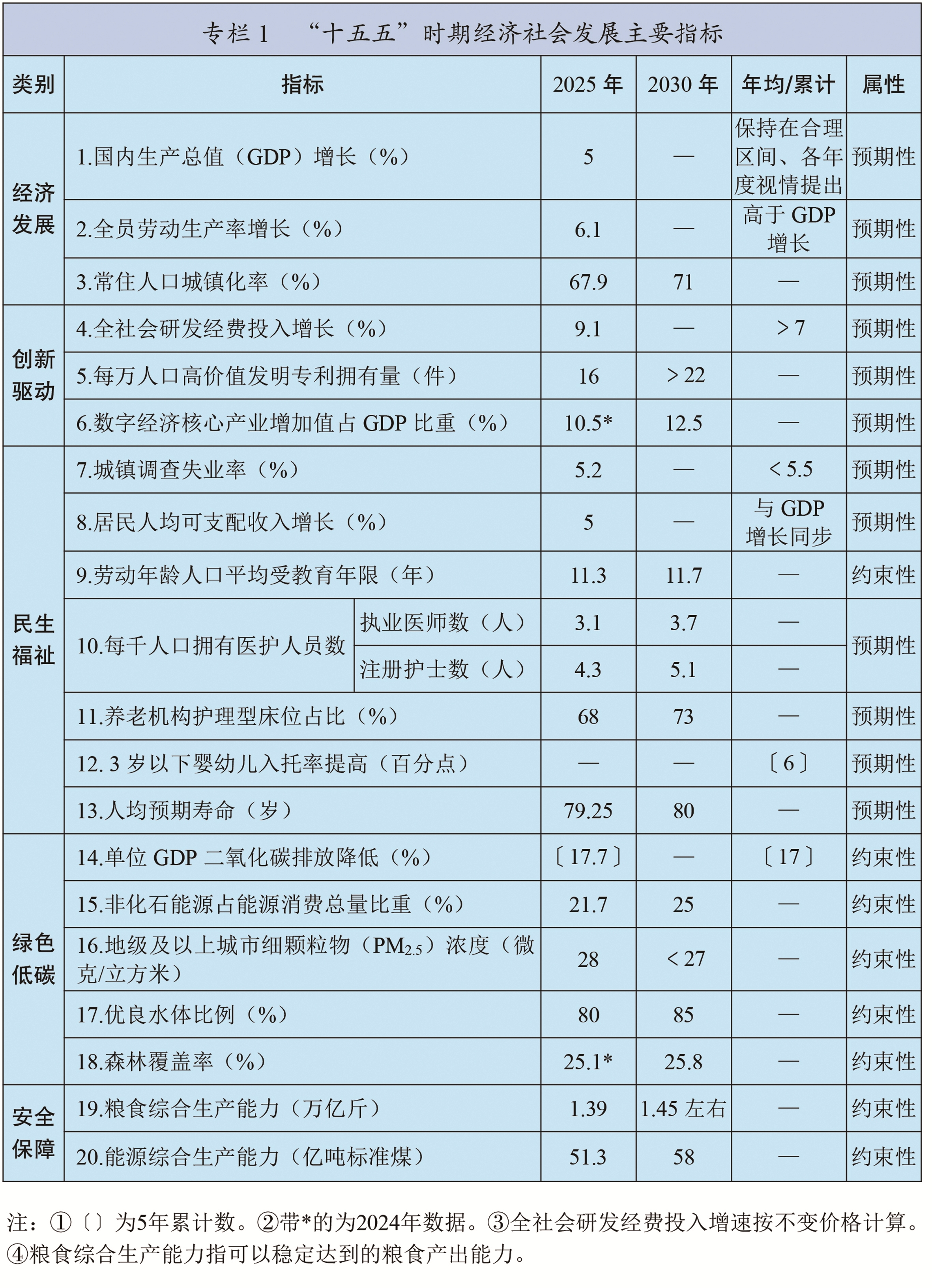 新发展理念引领作用全面彰显,构建新发展格局迈出重要步伐,新质生产力稳步发展,高质量发展扎实推进。经济运行稳中有进,国内生产总值突破140万亿元,现代化产业体系建设取得重大进展,基础设施支撑能力不断提升,数字经济核心产业增加值占比超过10.5%,城乡区域发展平衡性协调性增强。科技创新成果丰硕,全社会研发经费投入强度达到2.8%,攻克一批重大关键核心技术,取得一批重大原创科技成果。全面深化改革进一步推进,落实“两个毫不动摇”的体制机制不断完善,全国统一大市场建设取得积极成效,宏观经济治理效能进一步提升。高水平对外开放不断扩大,开放型经济新体制加快形成,高质量共建“一带一路”走深走实。全过程人民民主深入发展,全面依法治国有效实施。文化事业和文化产业蓬勃发展,精神文化产品丰富多彩。民生保障扎实稳固,居民人均可支配收入年均增长5.4%,城镇新增就业累计达到6242万人,劳动年龄人口平均受教育年限达到11.3年,人均预期寿命提升至79岁以上,脱贫攻坚成果巩固拓展。绿色低碳转型步伐加快,生态环境质量持续改善,非化石能源发电装机容量超过化石能源,地级及以上城市细颗粒物(PM2.5)浓度降至28微克/立方米,地表水达到或好于Ⅲ类水体比例超过90%,森林覆盖率超过25%。国家安全能力有效提升,粮食产量迈上1.4万亿斤大台阶,社会治理效能增强,社会大局保持稳定。国防和军队建设取得重大进展。“一国两制”实践深入推进。中国特色大国外交全面拓展。全面从严治党成效显著,反腐败斗争纵深推进,党的创造力、凝聚力、战斗力明显提高。