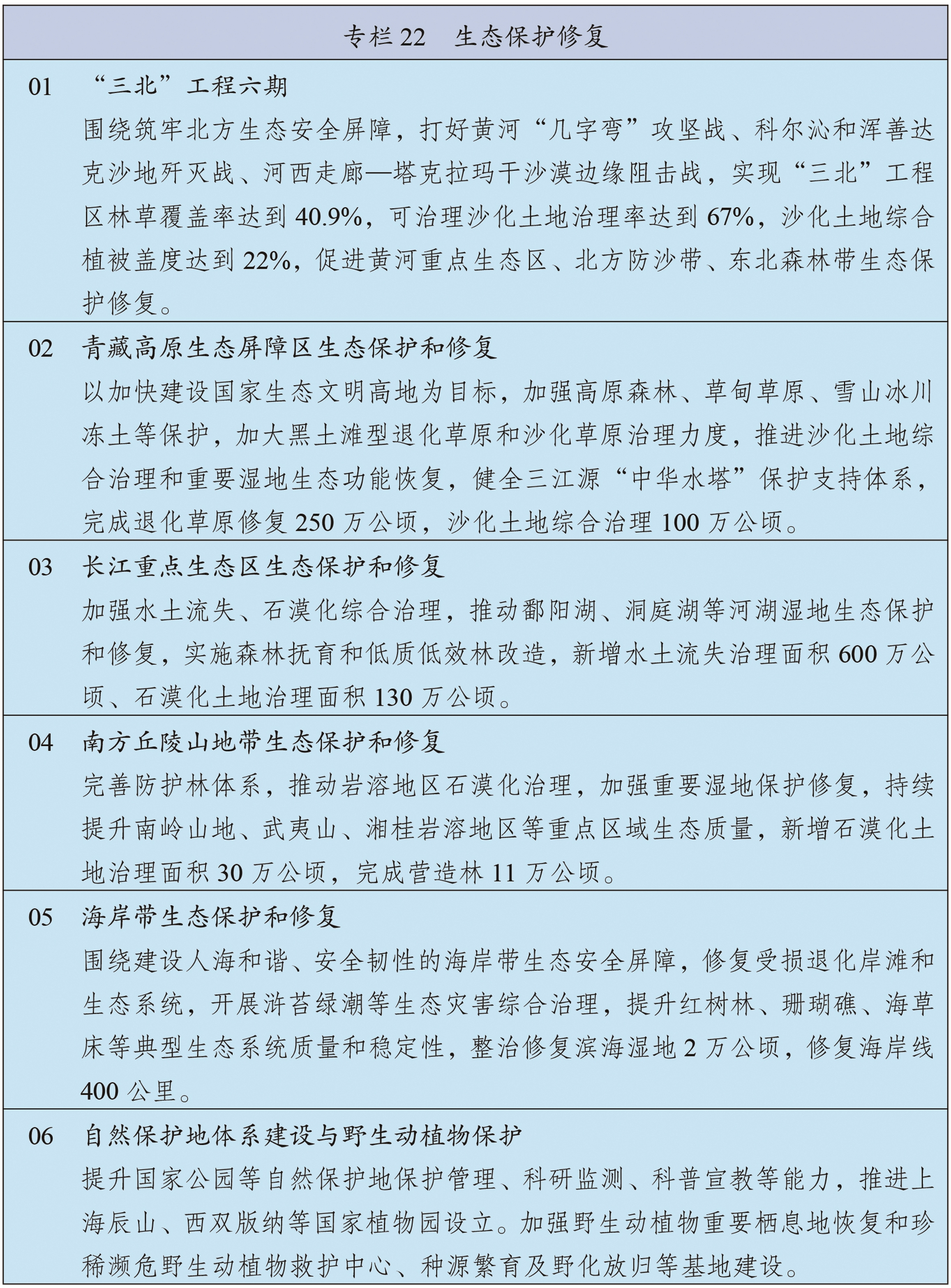统筹推进重要生态系统保护和修复重大工程,持续巩固以“三区四带”为骨架的国家生态安全屏障体系。打好“三北”工程攻坚战,推动三大标志性战役取得决定性胜利。深入推进青藏高原生态保护,加强重点区域水土流失治理和石漠化治理。科学开展大规模国土绿化行动,推进森林质量精准提升和国家储备林建设,森林蓄积量达到224亿立方米,统筹草原生态修复与合理利用,加强湿地保护修复。推进超引地表水和超采地下水治理,开展历史遗留废弃矿山生态修复。
