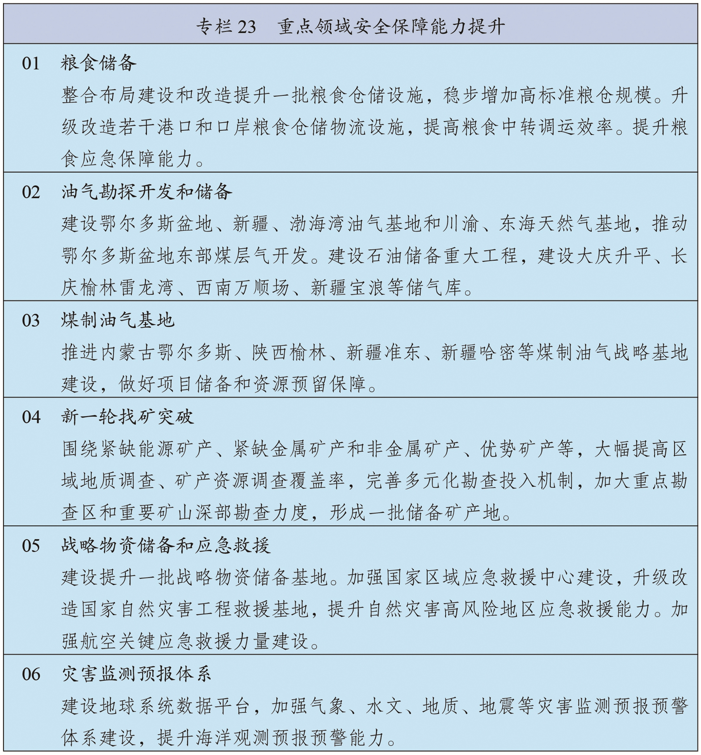 坚持立足国内、补齐短板、多元保障、强化储备,加强能源产供储销体系建设。坚持油气核心需求自主保障,实施中长期油气增储上产战略行动,确保原油年产量稳定在2亿吨左右、天然气产量稳步增长,加强煤制油气产能和技术储备。强化政府储备和企业储备协同,提升国家石油储备规模,建立更加灵活的轮换动用机制,增强天然气储备调节保障能力,完善煤炭储备体系。健全能源保供中长期合同制度,完善电力应急调度机制和备用电源配置,强化能源需求侧管理。加强战略性矿产资源勘探开发和储备,深入实施新一轮找矿突破战略行动,统筹加强产品、产能和产地储备,推动大宗商品储运基地建设,提升战略性矿产资源安全风险监测预警和应急保供水平。加强能源资源开发国际合作,维护战略通道安全。