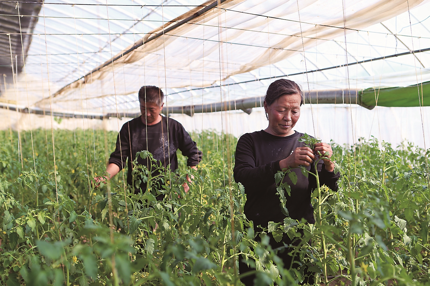 近年来,舒兰市吉舒街道曙光村积极打造长麻沟西红柿品牌,推动集生产、营销、观光于一体的现代农业产业园建设,不断提高村民收入。图为种植户正在进行绕绳、打杈、疏叶等管护工作。 本报记者 刘奥琪 摄