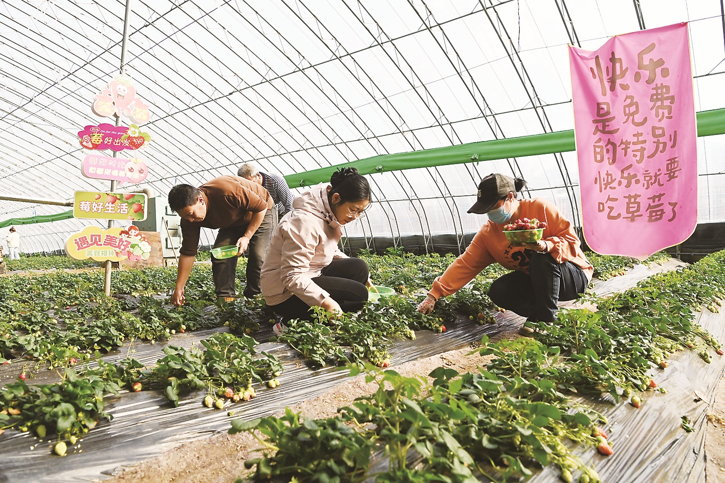 近年来,临江市大栗子街道采取党建引领合作社联建模式,积极培育果蔬苗超6.6万株,有效带动集体和农户增收超百万元。图为大栗子村栗兴草莓园内,市民在采摘草莓。 本报记者 钱文波 摄
