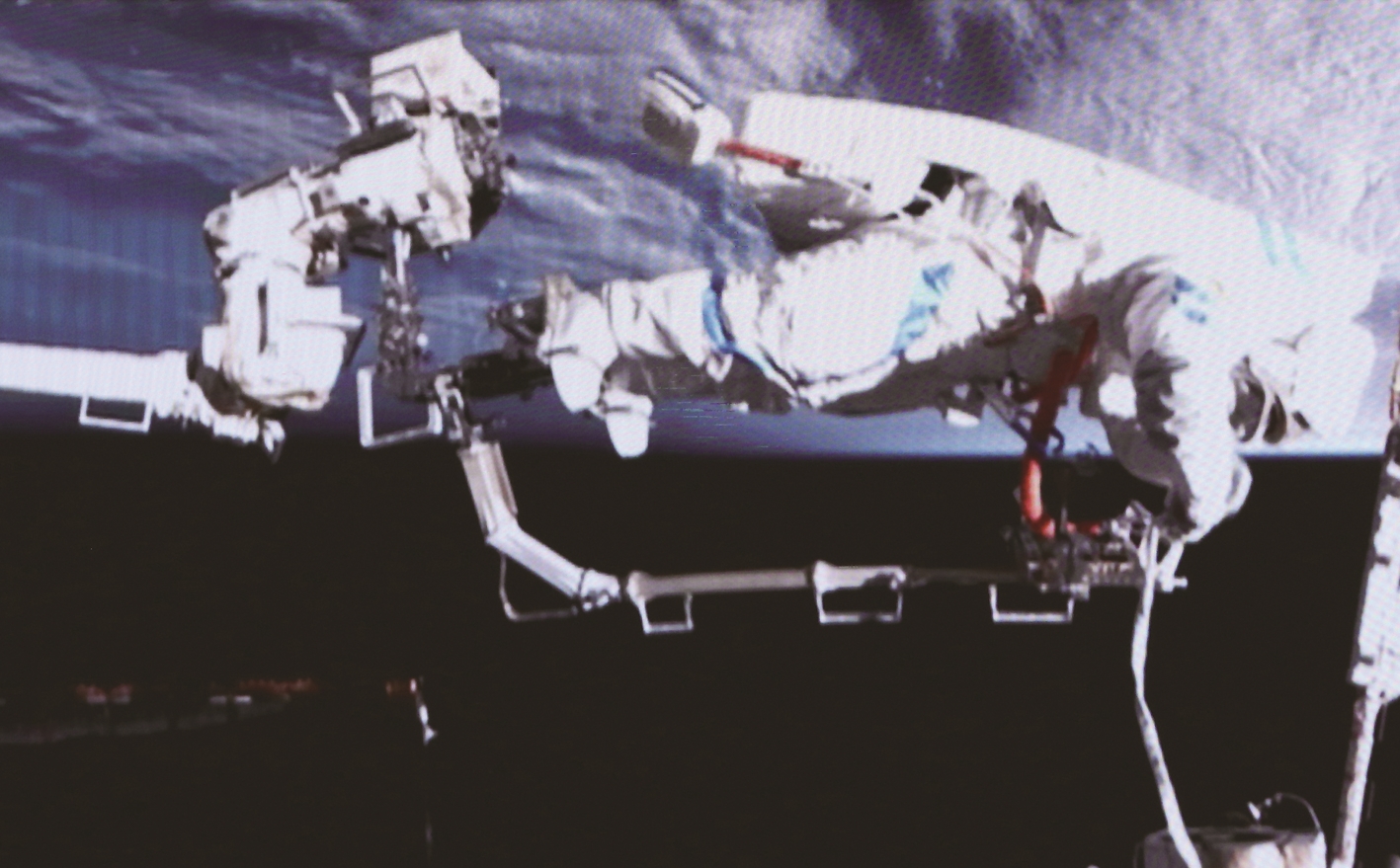这是3月16日在北京航天飞行控制中心屏幕上拍摄的神舟二十一号乘组航天员工作的画面。 3月16日19时35分,经过7小时的出舱活动,神舟二十一号乘组航天员张陆、武飞、张洪章密切协同,在空间站机械臂和地面科研人员的配合支持下,圆满完成空间碎片防护装置安装等任务。出舱航天员张陆、武飞已安全返回问天实验舱,出舱活动取得圆满成功。 新华社发(张帆 摄)