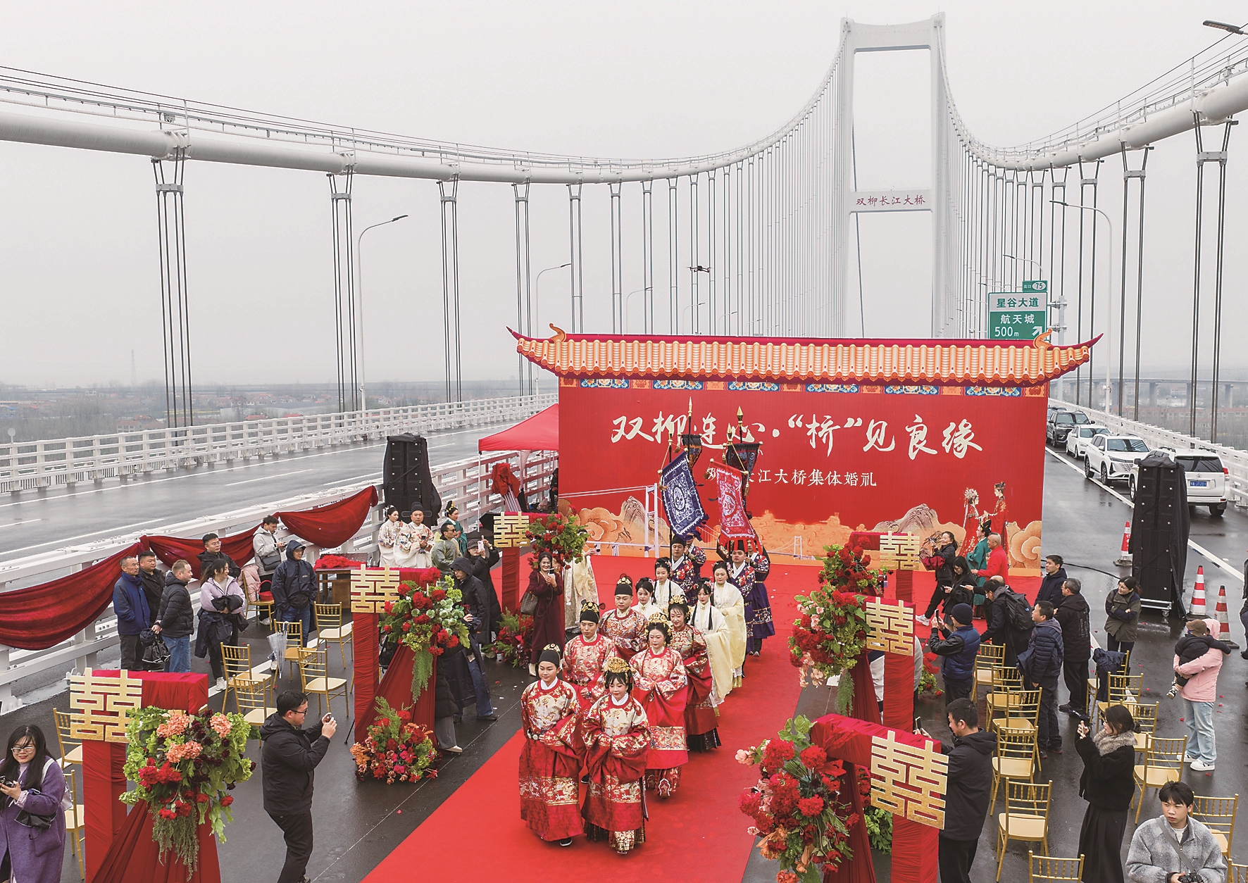 3月18日在双柳长江大桥建设工地拍摄的新人集体婚礼仪式现场。 3月18日,一场集体婚礼在位于湖北武汉的双柳长江大桥建设工地举行。来自湖北交通投资集团等建设单位的三对新人,身着中国传统婚礼服饰,在亲友和同事的祝福声中,携手步入婚姻殿堂。 新华社记者 肖艺九 摄
