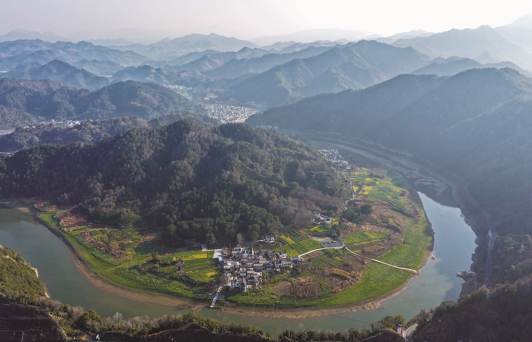 3月11日在安徽省黄山市歙县深渡镇拍摄的新安江沿岸美景(无人机照片)。时下,安徽省黄山市歙县新安江畔油菜花绵延铺展,春意盎然。 新华社发(施亚磊 摄)