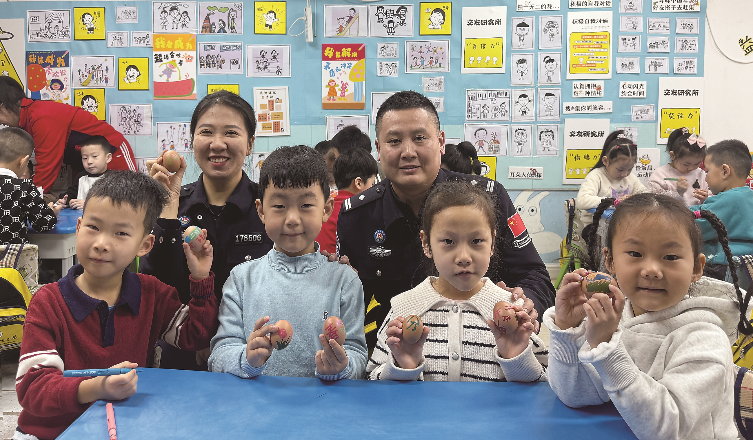 3月19日,吉林白山边境管理支队兴隆边境派出所组织民警到当地幼儿园开展“画彩蛋迎春分”活动,让孩子们通过“绘彩蛋”“立蛋”了解节气习俗,感受传统文化。 王潇 本报记者 钱文波 摄