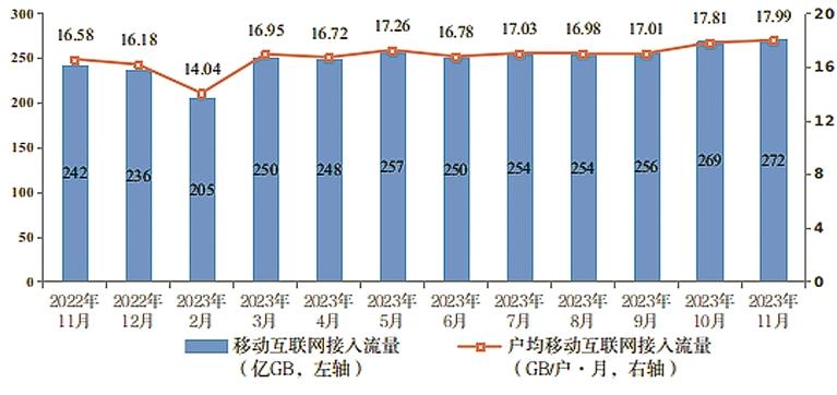 移动互联网流量较快增长,11月DOU值创年内新高。1—11月份,移动互联网累计流量达2728亿GB,同比增长14.6%。截至11月末,移动互联网用户数达15.1亿户,比上年末净增5611万户。11月当月户均移动互联网接入流量(DOU)达到17.99GB/户·月,同比增长8.5%,较上年12月份高1.81GB/户·月。