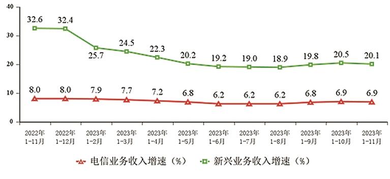 新兴业务收入维持较高增势。三家基础电信企业积极发展IPTV(网络电视)、互联网数据中心、大数据、云计算、物联网等新兴业务,1—11月份共完成业务收入3326亿元,同比增长20.1%,在电信业务收入中占比为21.4%,拉动电信业务收入增长3.8个百分点。其中云计算和大数据收入同比增速分别达39.7%和43.3%,物联网业务收入同比增长22.7%。