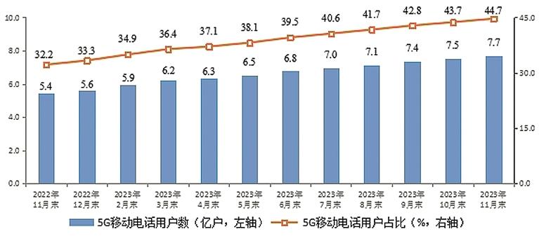 移动电话用户数稳中有增,5G用户规模加速扩大。截至11月末,三家基础电信企业的移动电话用户总数达17.26亿户,比上年末净增4269万户。其中,5G移动电话用户达7.71亿户,比上年末净增21040万户;占移动电话用户的44.7%,占比较上年末提高11.4个百分点。
