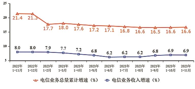 电信业务量收实现平稳增长。1—11月份,电信业务收入累计完成15548亿元,同比增长6.9%,按照上年不变价计算的电信业务总量同比增长16.6%,量收增速均与1—10月份持平。