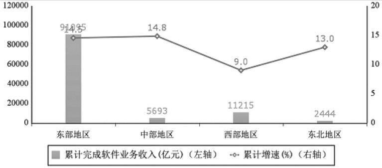 东部地区软件业收入加快增长,其他地区小幅回落。1—11月份,东部地区完成软件业务收入91095亿元,同比增长14.5%,增速较1—10月份提高0.6个百分点;中部地区完成软件业务收入5693亿元,同比增长14.8%,增速较1—10月份回落3个百分点;西部地区完成软件业务收入11215亿元,同比增长9%,增速较1—10月份回落1.2个百分点;东北地区完成软件业务收入2444亿元,同比增长13%,增速较1—10月份回落0.6个百分点。四个地区软件业务收入在全国总收入中的占比分别为82.5%、5.2%、10.2%和2.2%。