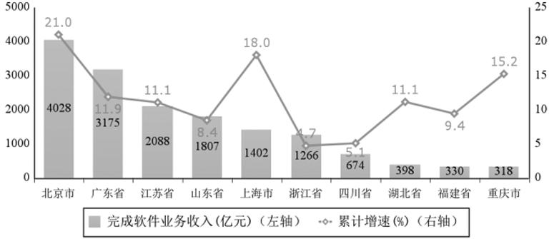 主要软件省份收入占比提高。1—2月份,软件业务收入居前5名的省份中,北京、广东、江苏、山东、上海软件收入分别为4028亿元、3175亿元、2088亿元、1807亿元和1402亿元,分别增长21%、11.9%、11.1%、8.4和18%,合计软件业务收入12500亿元,占全国比重为73.3%,占比较去年同期提高1.8个百分点。