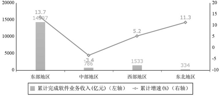 东部地区增势突出,中部地区小幅下滑。1—2月份,东部地区完成软件业务收入14397亿元,同比增长13.7%;中部地区完成软件业务收入786亿元,同比下降3.4%;西部地区完成软件业务收入1533亿元,同比增长5.2%;东北地区完成软件业务收入334亿元,同比增长11.3%。四个地区软件业务收入在全国总收入中的占比分别为84.4%、4.6%、9%和2%。