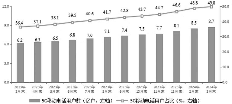移动电话用户规模稳中有增,5G用户占比近五成。截至3月末,三家基础电信企业及中国广电的移动电话用户总数达17.55亿户,比上年末净增1124万户。其中,5G移动电话用户达8.74亿户,比上年末净增5157万户,占移动电话用户的49.8%,占比较上年末提高3.2个百分点。