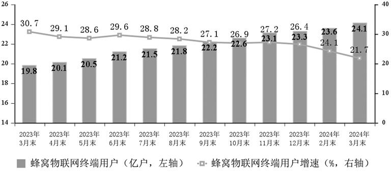 蜂窝物联网用户增长较快,IPTV(网络电视)用户稳步增加。截至3月末,三家基础电信企业发展蜂窝物联网终端用户达24.14亿户,比上年末净增8135万户,占移动网终端连接数(包括移动电话用户和蜂窝物联网终端用户)的比重达57.9%。IPTV(网络电视)总用户数达4.07亿户,比上年末净增551.3万户。