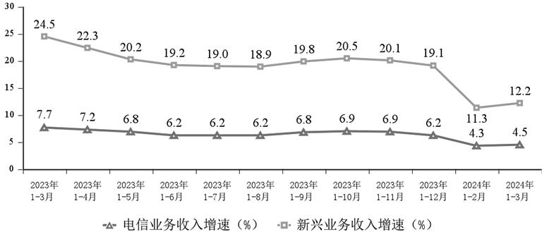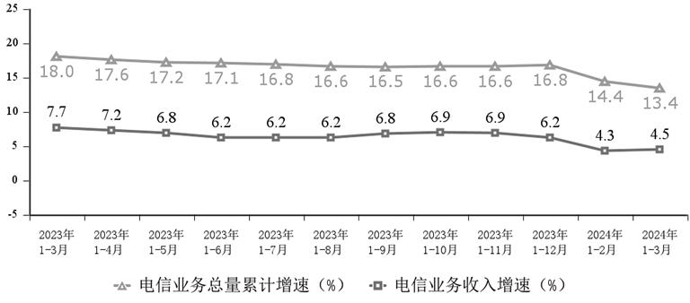 电信业务收入稳中有升。第一季度,电信业务收入累计完成4437亿元,同比增长4.5%,增速较1—2月份提升0.2个百分点。按照上年不变价计算的电信业务总量同比增长13.4%。